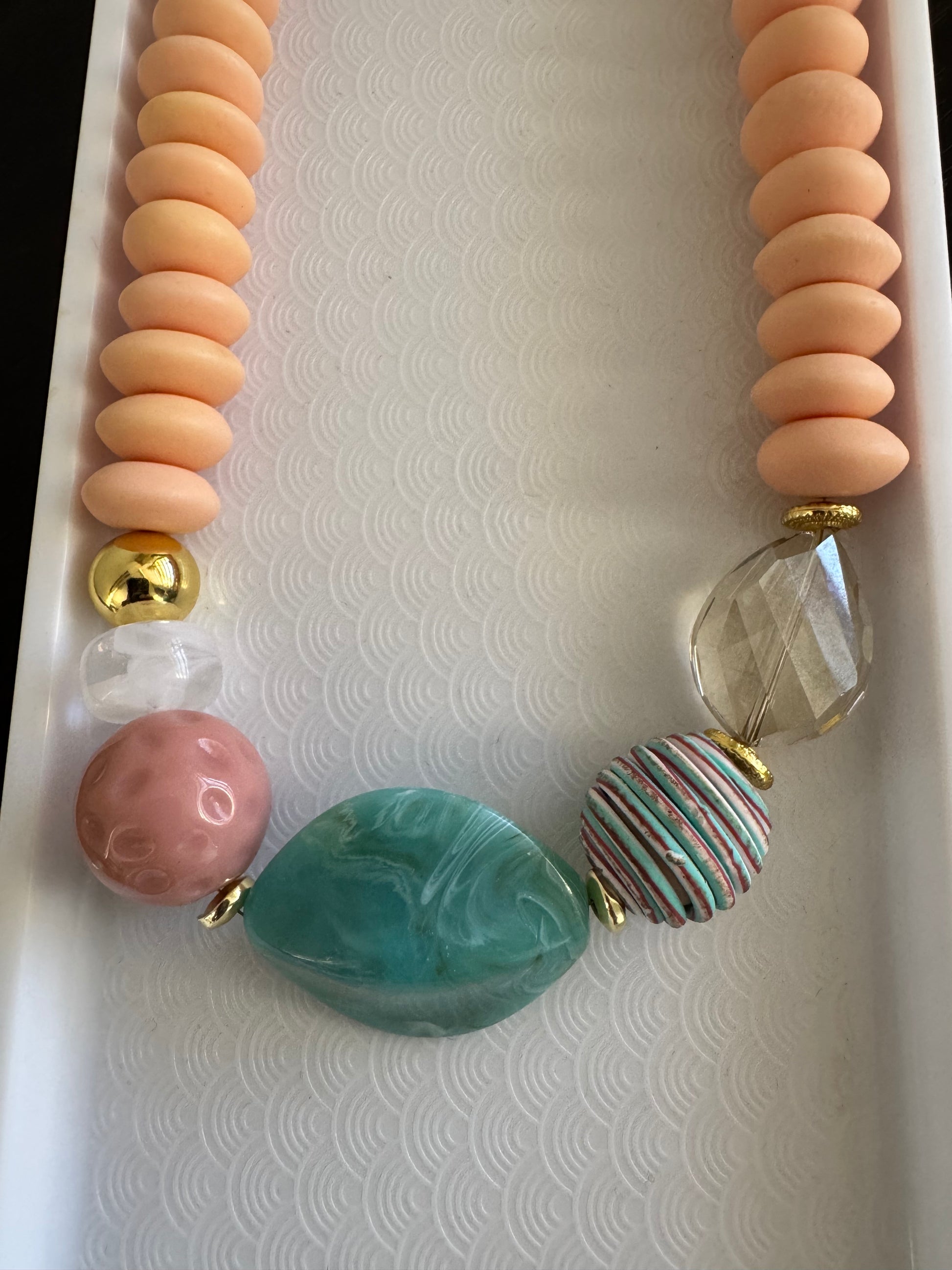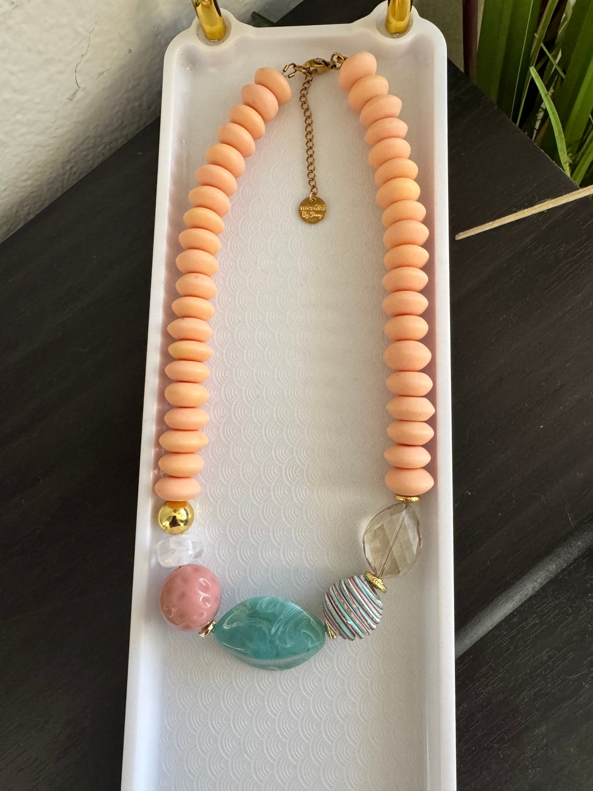 Un diseño que combina la serenidad del azul turquesa con la calidez del coral. Blush Horizon celebra los tonos suaves del otoño con un aire fresco y sofisticado. Cada bead cuenta una historia de color y textura, creando una pieza única que ilumina cualquier look con delicadeza y estilo.