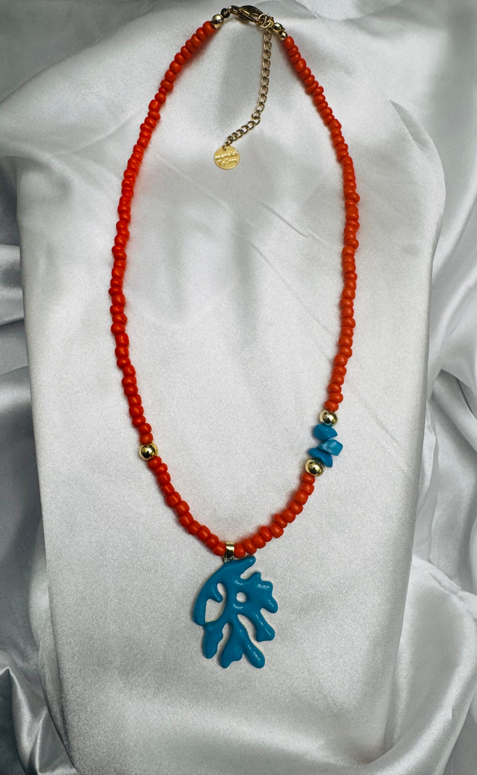 Collar de beads en tono coral con detalle de coral turquesa pintado a mano. Mide 16” + 2” de extensor. Ideal para darle un toque vibrante y playero a cualquier look — úsalo solo o combínalo con otras piezas de la colección para un layering irresistiblemente veraniego. Pieza única.