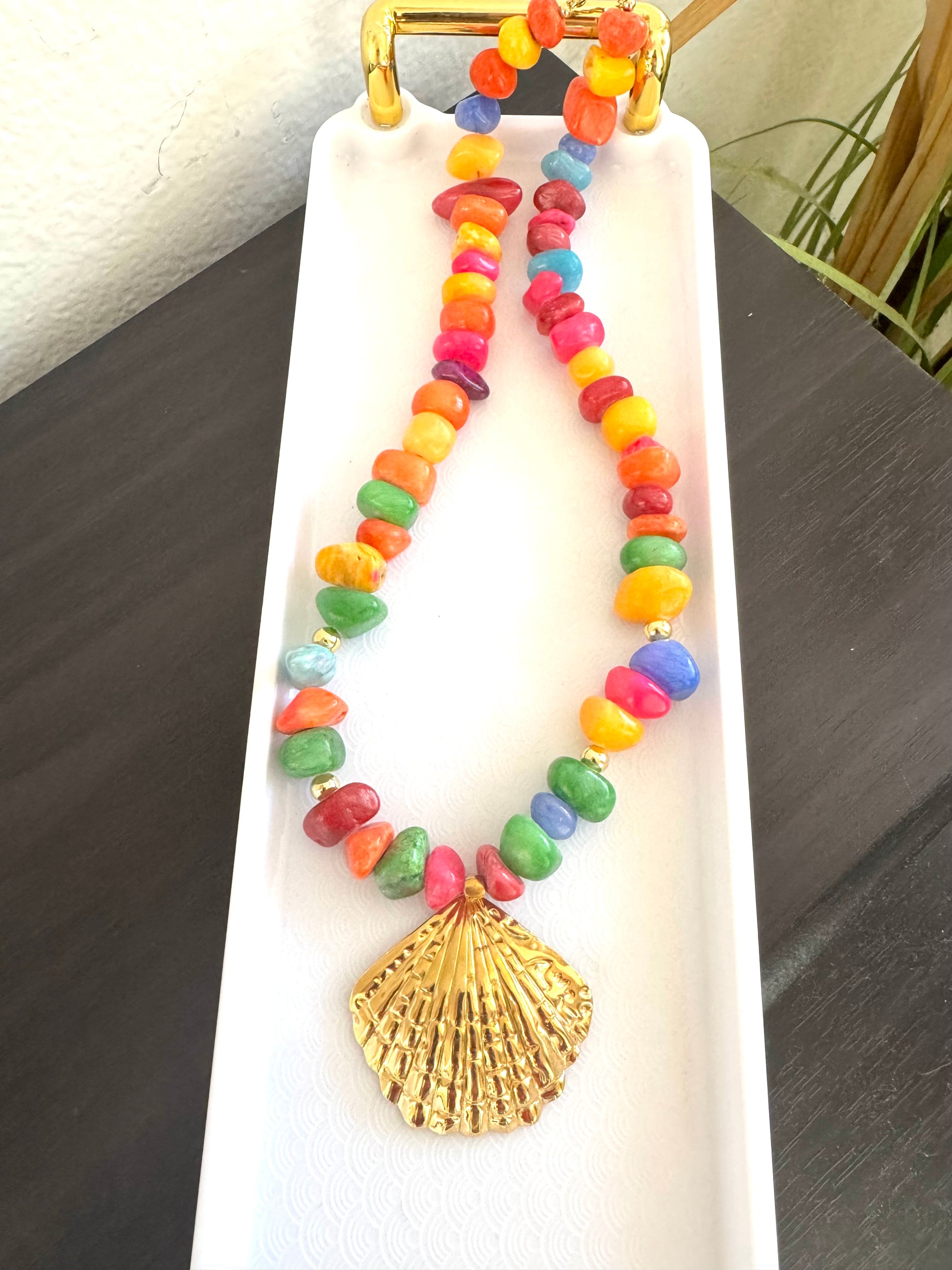 Sus piedras multicolor en tonos vivos evocan los días de sol y la calidez del Caribe, mientras que el dije dorado en forma de concha aporta un toque sofisticado y audaz.
