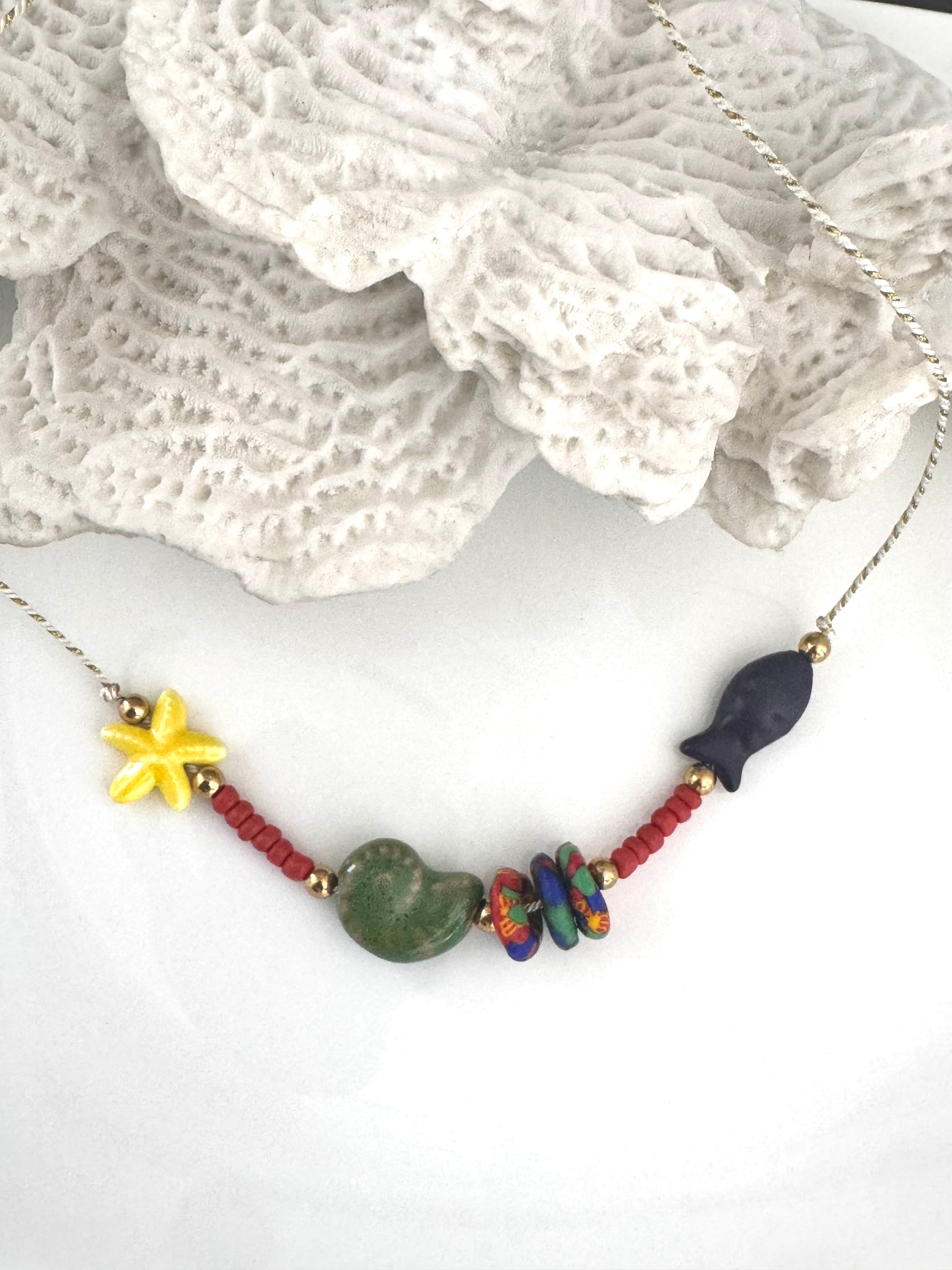 Un diseño que celebra la diversidad y alegría del Caribe. Este collar combina una estrella amarilla, caracol verde, pez azul marino y discos multicolor sobre una base de mini beads rojos. Todo montado en cordón dorado y blanco, para dar un aire fresco y elegante.