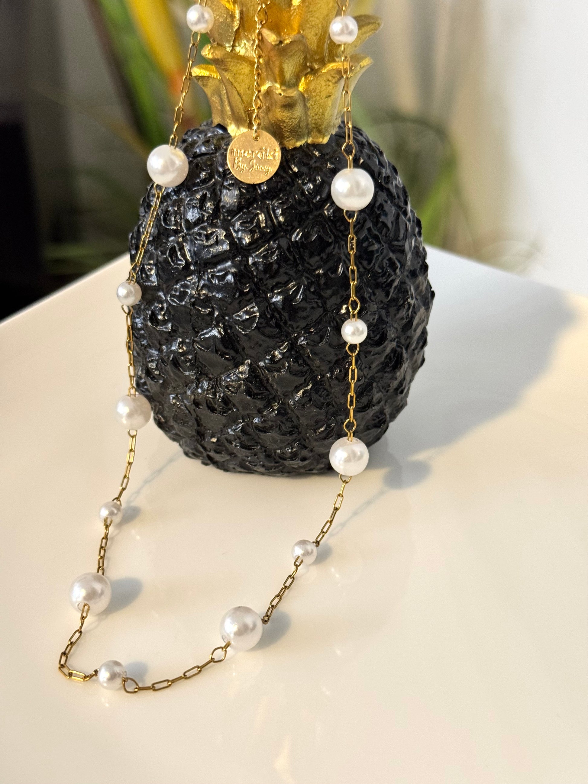 Eleva cualquier outfit o completa tu layering que este collar tipo choker imitando perlas. Mide 14” + 2” de extensor.