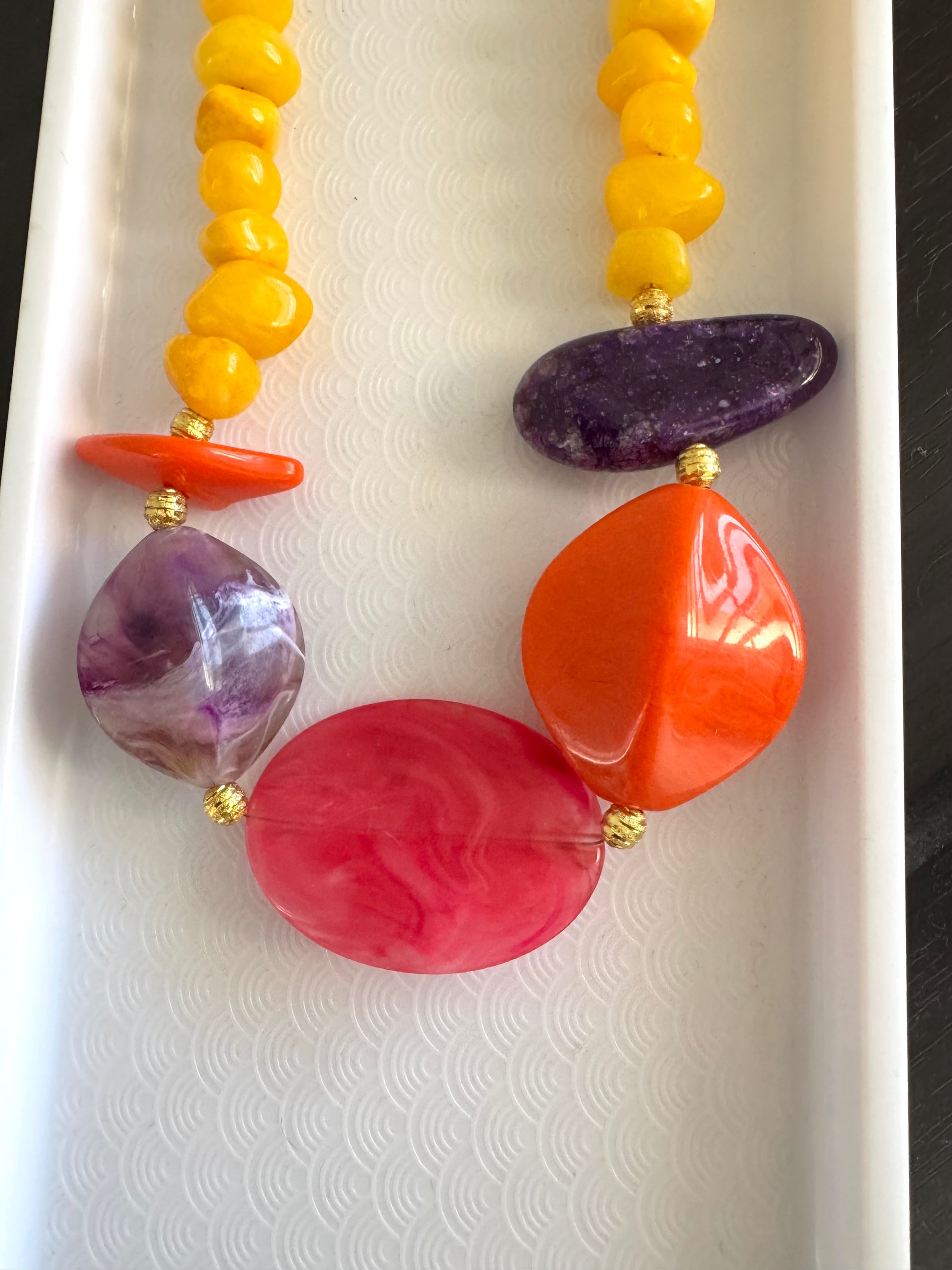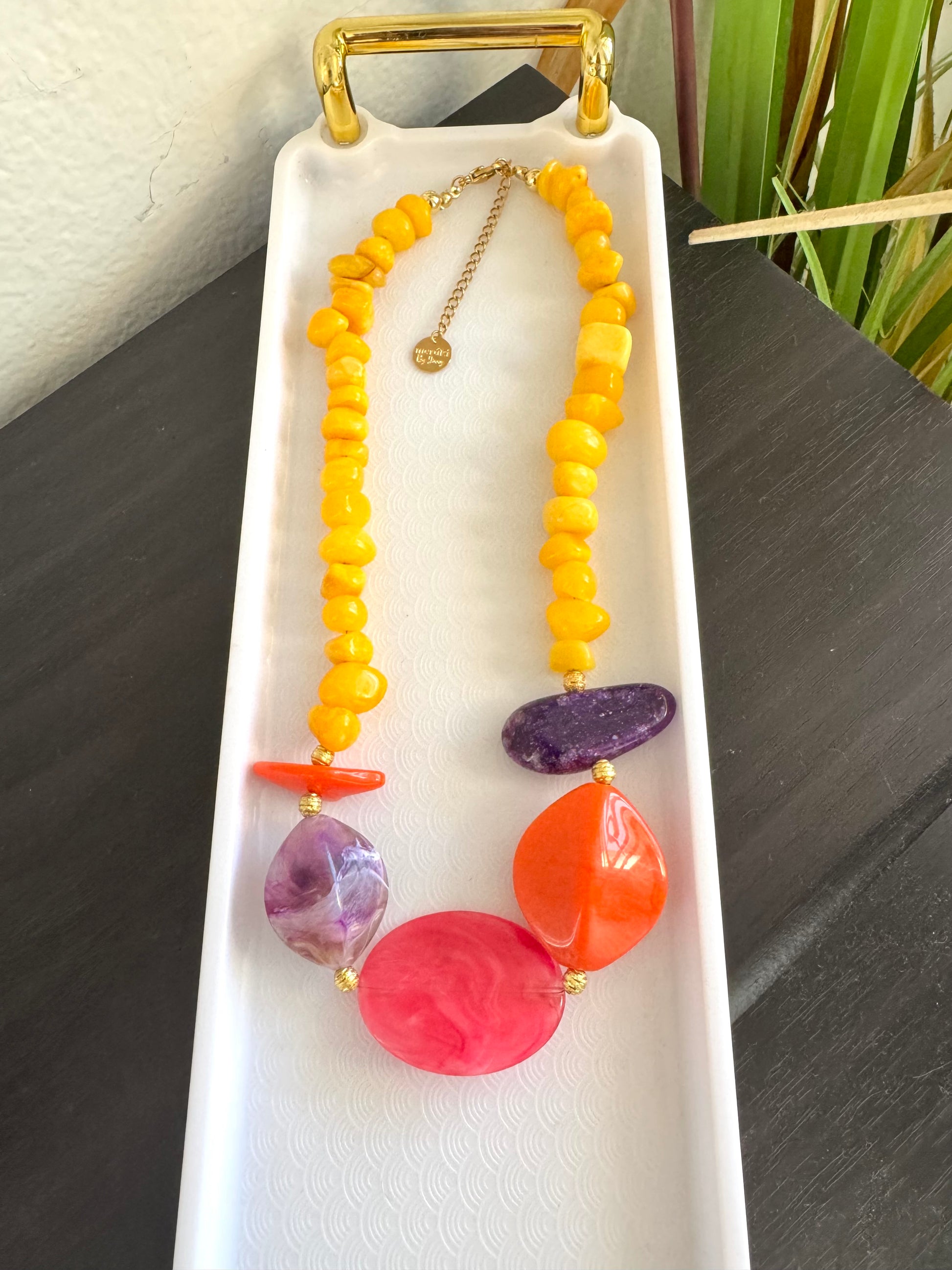 Sunset Bloom combina matices vibrantes de ámbar, fucsia y amatista para crear una pieza audaz, femenina y llena de energía. Perfecto para mujeres que florecen en cada etapa y dejan huella con su luz. ✨